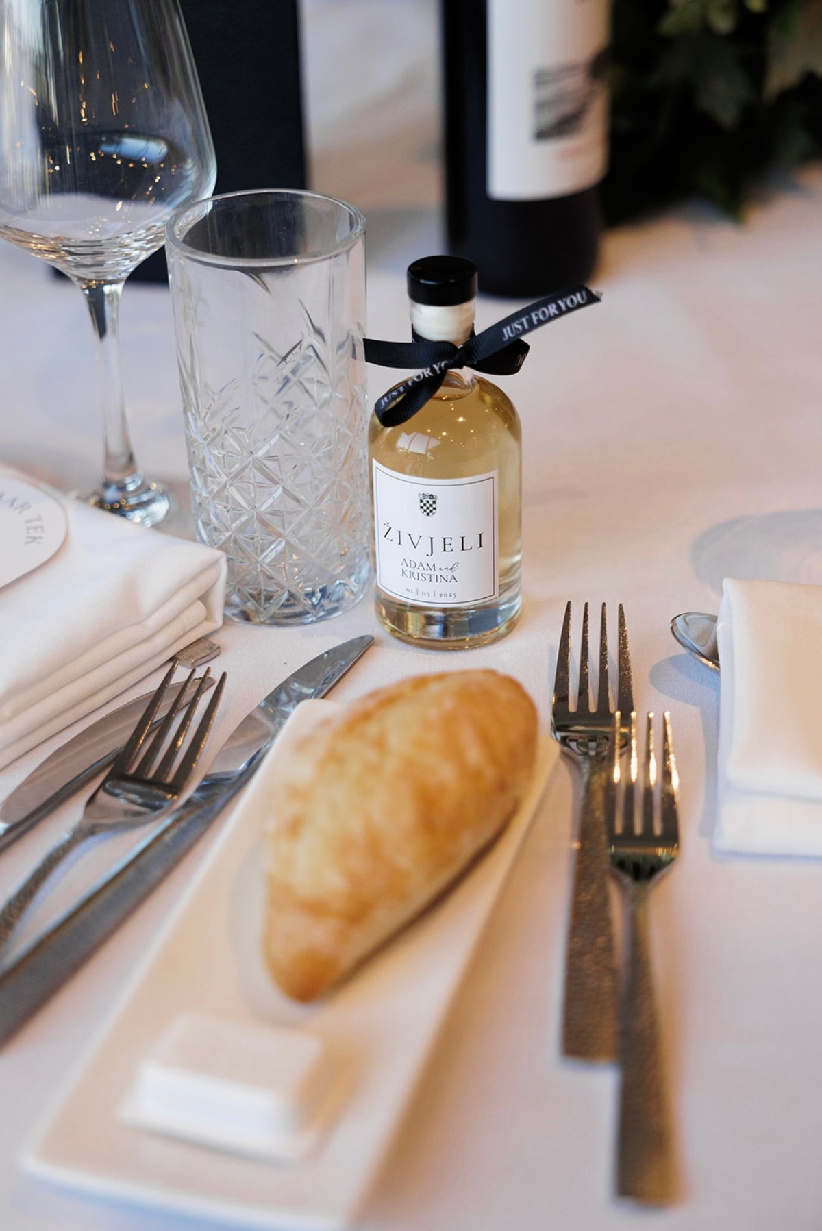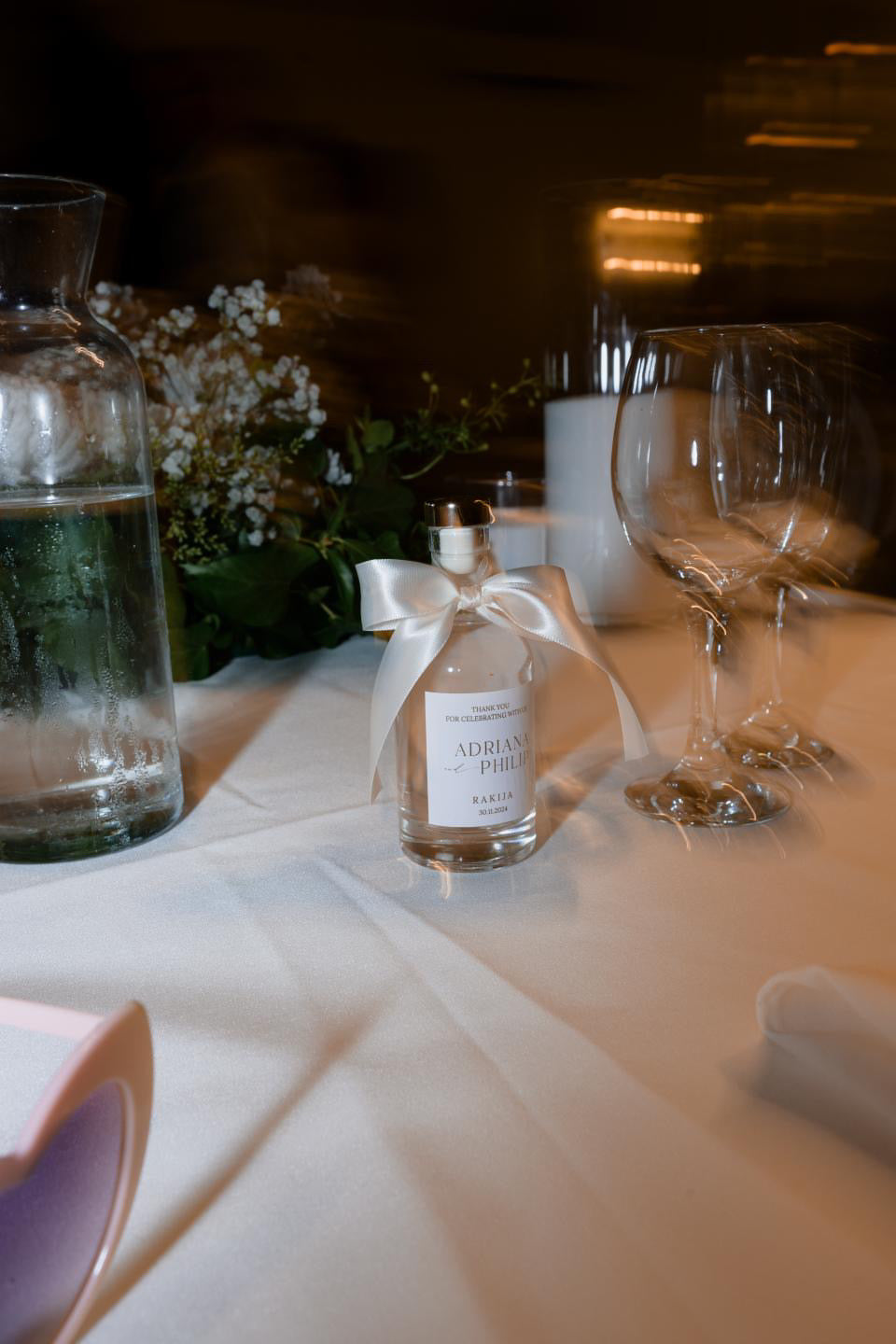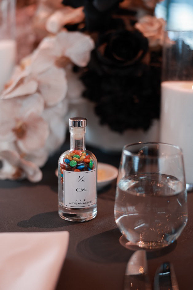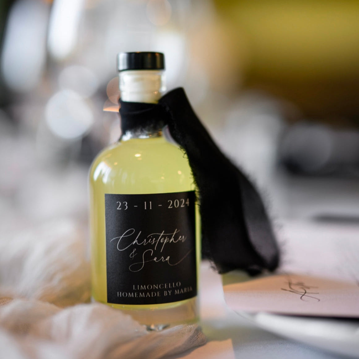 A fully custom 100ml favour bottle, supplied empty and designed to be filled with your own spirit, oil, chocolate or salts. Perfect for rakija favours, limoncello favours, ouzo favours, arak favours, olive oil favours, or any other spirit of your choice.